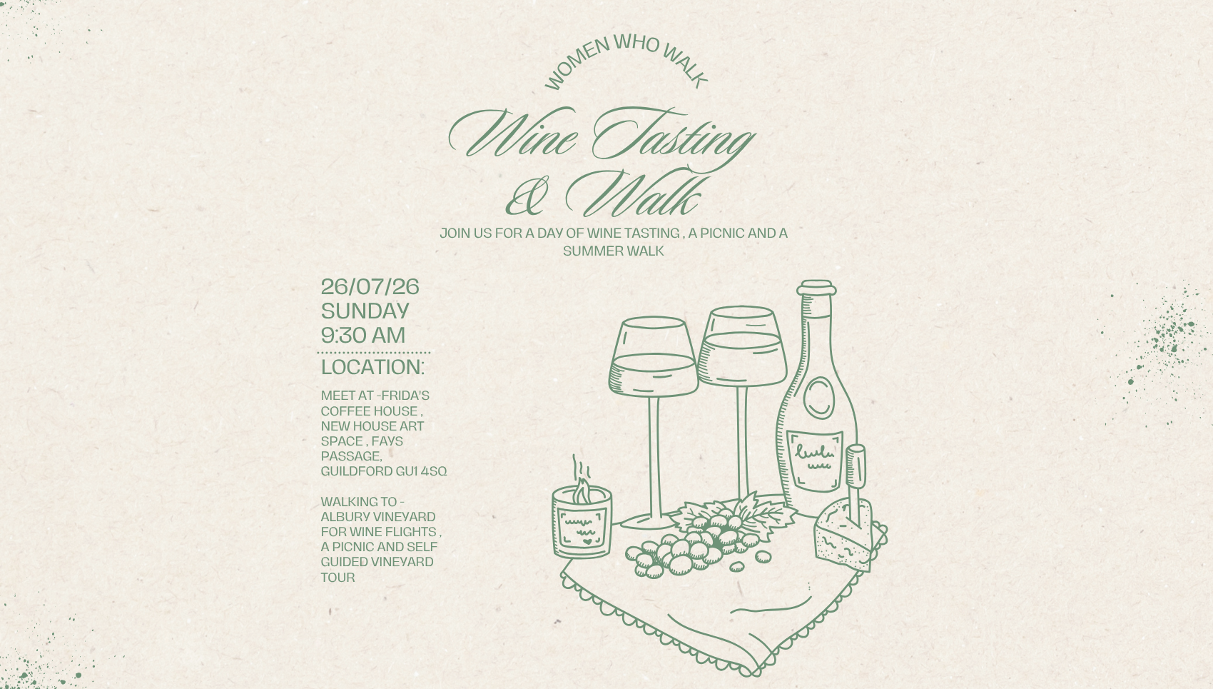 Join us for a summer walk across the fields to Albury Vineyard, Silent Pool, Shere road, GU5 9BW, where we have a table on the patio booked for 1pm.
